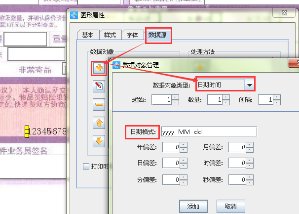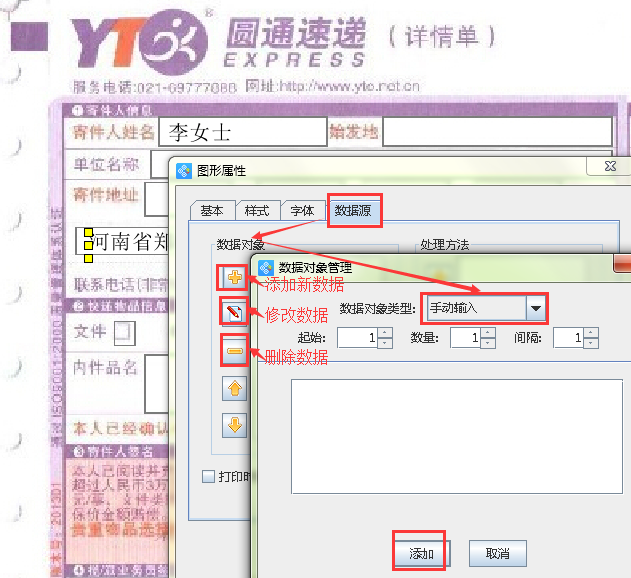 3.1一般填寫的內(nèi)容為:寄件人姓名、單位名稱、地址、聯(lián)系電話、日期。那么,在快遞單寄件人姓名后面繪制一個(gè)普通文本,然后雙擊文本,出現(xiàn)圖形屬性窗口(圖1所示),選擇“數(shù)據(jù)源”,點(diǎn)擊左側(cè)“-”按鈕,清除原有數(shù)據(jù),然后點(diǎn)擊黃色“+”按鈕,選擇“手動(dòng)輸入”,數(shù)據(jù)對(duì)象中輸入真實(shí)收件人姓名即可。然后復(fù)制剛完成的普通文本,移動(dòng)至寄件地址后面,然后雙擊文本,出現(xiàn)圖形屬性窗口,選擇“數(shù)據(jù)源”,點(diǎn)擊左側(cè)“紅色筆”按鈕,修改內(nèi)容,修改為“河南省鄭州市高新區(qū)華強(qiáng)廣場(chǎng)**單元**室”。按照相同的操作方法,依次設(shè)置單位名稱、聯(lián)系電話項(xiàng)即可(圖2所示)。設(shè)置“日期”時(shí),雙擊文本,出現(xiàn)圖形屬性窗口,選擇“數(shù)據(jù)源”,點(diǎn)擊左側(cè)“-”按鈕,清除原有數(shù)據(jù),然后點(diǎn)擊黃色“+”按鈕,選擇“日期時(shí)間”,由于快遞單時(shí)間為*年*月*日格式,我們將時(shí)間格式更改為此格式即可(圖3所示),最后得到如下圖4所示的效果圖。