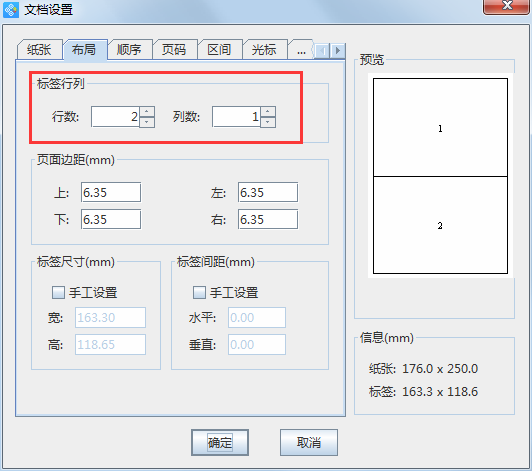 首先打開領(lǐng)跑條碼標簽打印軟件,新建標簽時,設(shè)置紙張尺寸為176*250mm(B5紙張尺寸),在“布局”選項中,設(shè)置標簽行列為2行1列,頁面邊距為默認數(shù)值,完成后點擊“確定”。