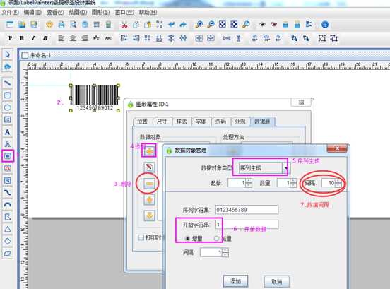 點左側(cè)工具欄中的條碼圖標(biāo),繪制條碼對象后,雙擊該條碼,彈出的圖形屬性窗口下,其他選項可以保持默認,選擇“數(shù)據(jù)源”選項卡,刪除默認的數(shù)據(jù)后,添加“序列生成”數(shù)據(jù)對象類型。
