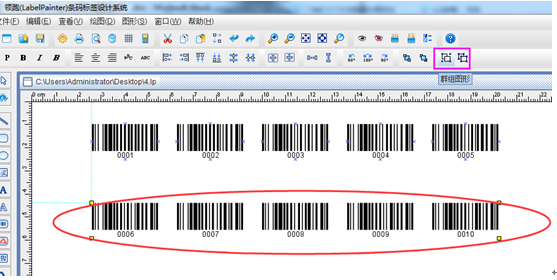 如果需要對上下2行條碼調(diào)整位置或是整體的所有條碼調(diào)整位置,可以全選小條碼,然后點“群組”工具,就可以將選中的對象,合并成一個整體。