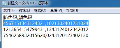 以16位防偽碼為例,首先準(zhǔn)備一個(gè)txt文本數(shù)據(jù),數(shù)據(jù)內(nèi)容格式為:防偽碼,顏色碼。如圖: