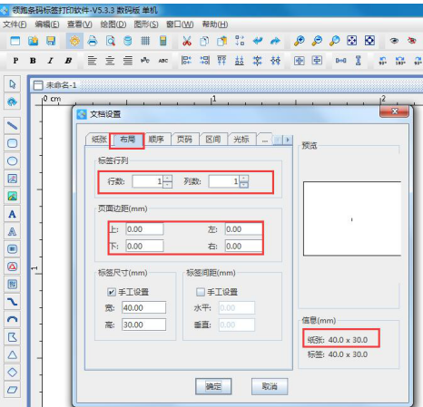 在中瑯條碼打印軟件中設置標簽紙的尺寸,如果是單列的標簽紙,紙張尺寸就是單個標簽的尺寸,“布局”中輸入1行1列,頁邊距都是輸入為0;