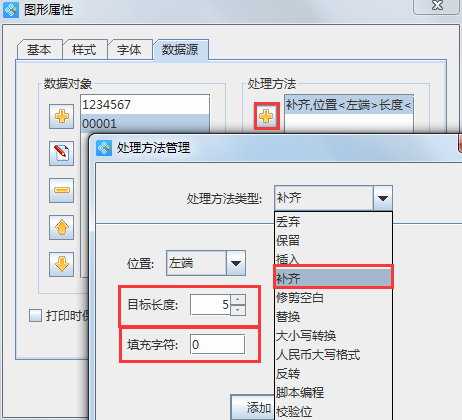 鼠標選中序列生成的數(shù)據(jù)對象,點擊右側(cè)“處理方法”欄內(nèi)的+號按鈕,在彈出的“處理方法管理”窗口中,設(shè)置處理方法類型為“補齊”,目標長度為“5”,填充字符為“0”,設(shè)置完成后點擊添加即可。