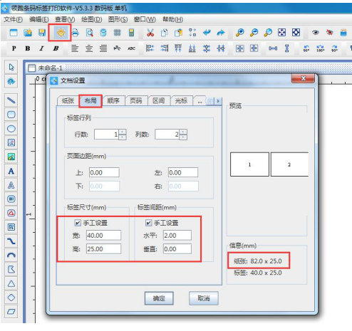 如果是多列的標簽,一行標簽的尺寸就是紙張尺寸(不帶底襯紙露出來的邊距),布局中的行列就是1行N列(有幾列標簽就輸入幾)。并勾選手工設置標簽尺寸,輸入單個標簽的尺寸,
